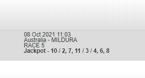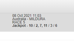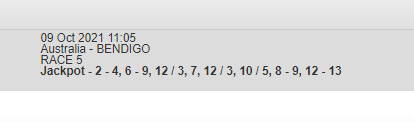 Last leg of the jackpot, i like Ozzie Battler 3rd fav. Odds on Bernie Winkle was once beaten by Ozzie Battler at Swanhill 3 months back while badly drawn, which is the case again today. Ozzie might lead if Gilt Hanover doesn't dispute or at least sit on death from wide draw and will be hard to beat. Gilt Hanover is good on the short distances tho she is a real danger.