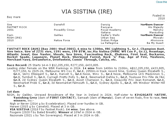 Champion Via Sistina became the first eight-year-old mare in 80 years to win a Group 1 race, she has now won 10 majors at racing's highest level and earned more than $13m prizemoney after her comeback win at Royal Randwick on Saturday.