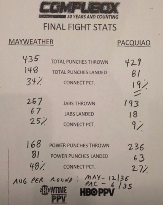 Having said that ,I find these stats difficult to swallow..................just for starters ,if Mayweather threw an overage of over 20 JABS per round they obviously count just straightening your arm ................no way did he throw that many with any intent IMO !