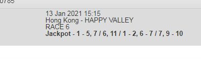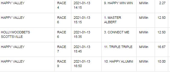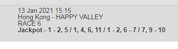 1 Horse Racing Hong Kong HAPPY VALLEY RACE 3 2021-01-13 13:45 12. FAIRY FLOSS M/Win 7.69 Pending