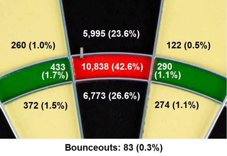Below: the distribution of a sampled 25,440 darts thrown in 2016 at T20 from 7 different top-32 PDC players.