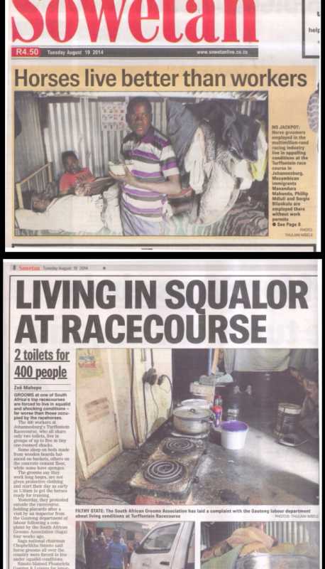 The grooms (the Giant- without their cheap labour there would be no Racing) should have been treated with respect years ago and this would not have happened- You cannot have people living like pigs when the horse they look after cost R600 000 and they who look after it should earn R30 a day? It was only a matter of time before they found a voice -