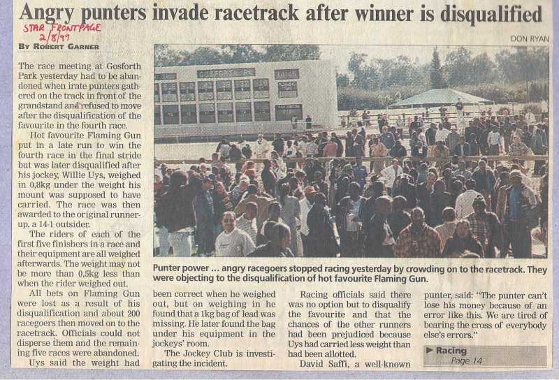 This happened on 1 August 1999. Our horse Lawman was 3rd in the running, but was promoted to 2nd after Flaming Gun was disqualified! This was the day that punters stood up for themselves, together!!