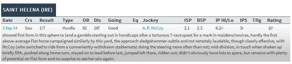 They interviewed the trainer who stated that the mare, who had been a very buzzy type in the past, settled better and had benefited from a break of 125 days since her last run. He added that Saint Helena was suited by the firmer ground on this occasion.