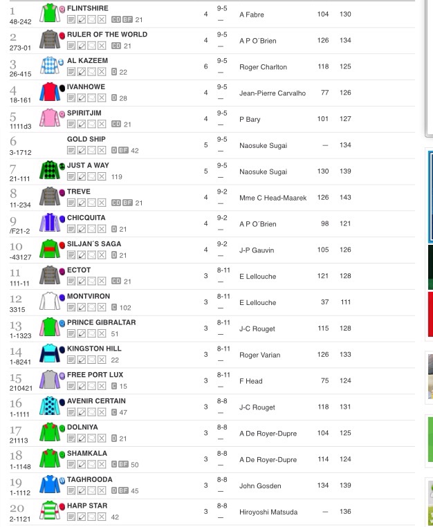 Shamkala that's all u need to know for the arc, if they run her in the arc and not the dollar.. Soumillon on her back, bottom weight and still improving with only 3 starts shud improve from last time out against avenir who had its 5th start and in good to soft ground, no rain forecast for the week so it wud be hopefully better ground.. A lot in her favour.. Where avenir is, shamkala will be ahead of it maybe why benoist chose to ride ectot instead..