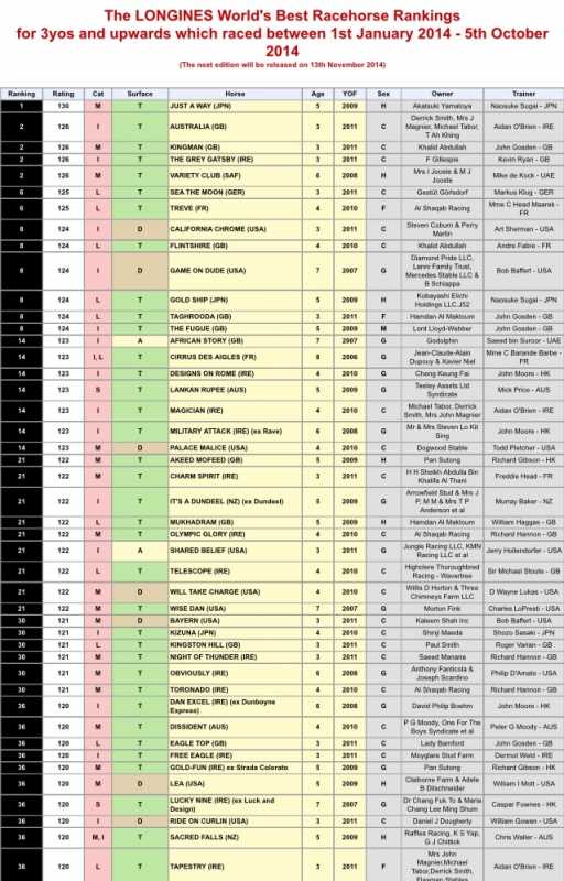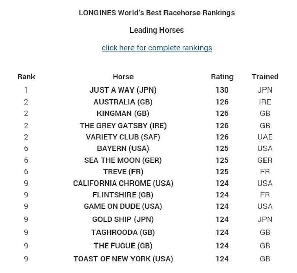 Is it just me or do these ratings seem a bit out of whack? I am happy with the Variety Club rating but what about Treve and Just A Way? Is the latter really the best horse in the World this season? Overall they look a bit messy to me and I wonder if there isn't a political element to some of these ratings.