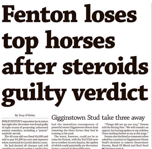 Fenton, who is considering an appeal, has been fined €6,000 and must pay more than €10,000 in total costs following the hearing. The Turf Club will now launch its own investigation into the case following the trainer's guilty verdict.