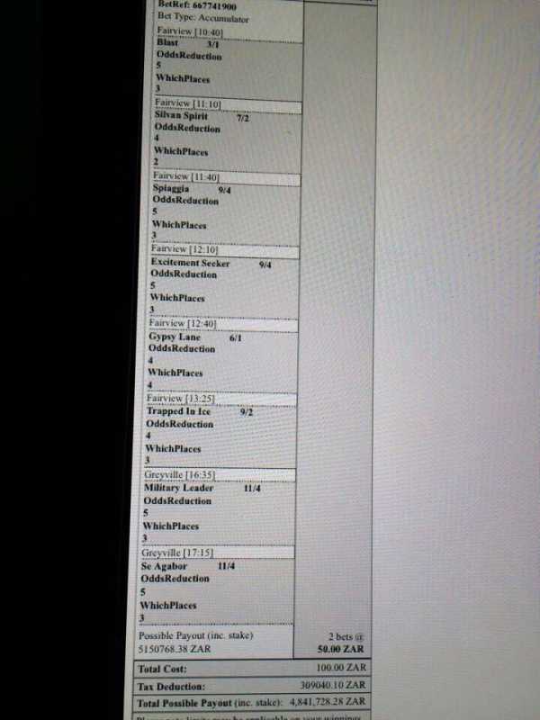 11 years 5 months ago - 11 years 5 months agoDave Scott wrote: If you were realistically trying to take a bet via the tote the last few winners would drop dramatically with the amount of winning tickets and your last 11/4 shot would be paying R1.10 for a win