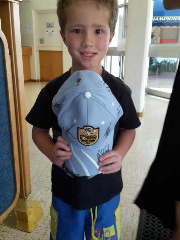 I think he wants to be a jockey one day...went around to all the jocks to collect signatures for his cap...