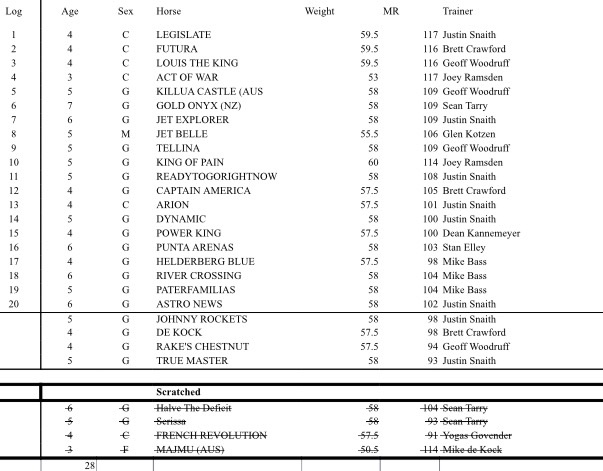 The connections of Johnny Rockets, De Kock, Rake’s Chestnut and True Master will face a few nail-biting days ahead of the final field announcement as they are the only horses of the remaining 24 entries that are outside of the top 20. However, the only filly still among the entries, Jet Belle, who is currently eighth on the log, might provide one place as her trainer Glen Kotzen said she would probably run in the Gr 1 Klawervlei Majorca Stakes instead.
