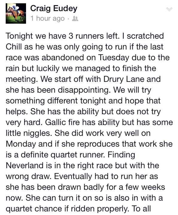 Have a small share in Dark Rose in the 7th. Doug say's she has come on since her last run and is fit and well. We are expecting a big run from her tonight and expect her to give the two favorites something to think about. Bomi looks the one to beat with decent form and a strong front runner. Drier would have the best idea of where the horses stand as he trains both Bomi and Black Velvet, who beat Dark Rose last time out, so would know how these two compare.