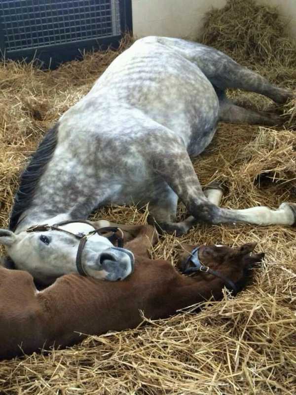 Tap of the Day (full sister to Tapit) rests her head on her new Tiznow filly