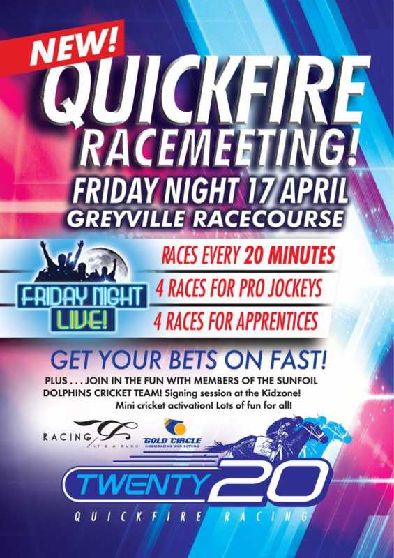 In what is being termed the 20/20 of racing Greyville will be hosting an 8 race card meeting with just 20 minutes between each race...to help expedite things the races will alternate between Jockeys and Appies, with Race 1,3,5,7 being Jockey Races and 2,4,6,8 restricted to appies...1st race jumps at 17:55 and the Last at 20:15 fasten your seat belts ,
