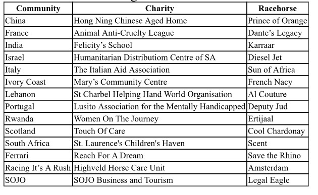 Below is the full list of Intercontinental Village communities and other entities that were included in the draw together with the charity and media partner they will be representing and the horse that will be running for them.