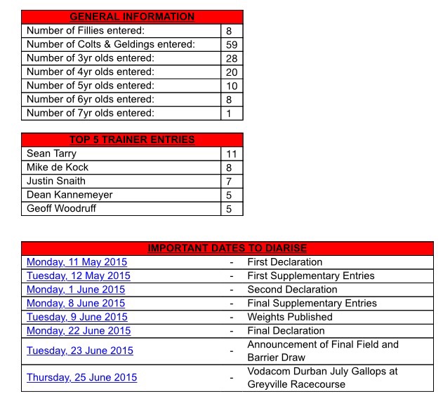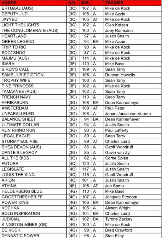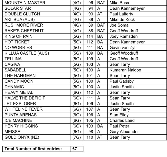 Sean Tarry, who has an enviable recent record in the race having won two of the last three running’s with Pomodoro and Heavy Metal, has nominated eleven runners while Mike de Kock has entered 8, Justin Snaith 7 and Dean Kannemeyer 5.