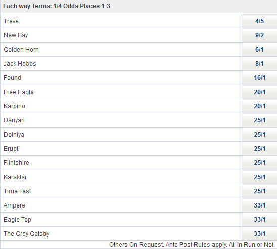 But Paddy Power are 11/2 Golden Horn,when they pull out Jack Hobbs,which is highly likely according to someone at yard.GH has Treve to beat,fantastic horse that Treve is,she is prone to niggles.i think Golden Horn will improve from The Derby,which is looking like top form this year.When Jack Hobbs won in Ireland I loaded up on GH at 6/1.