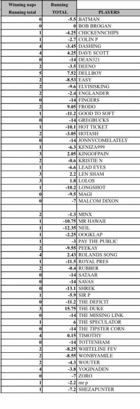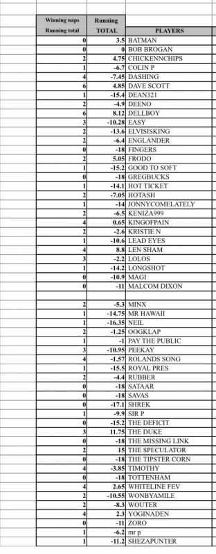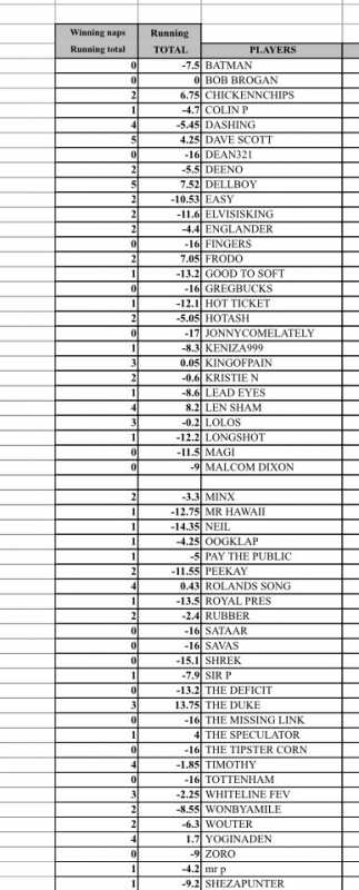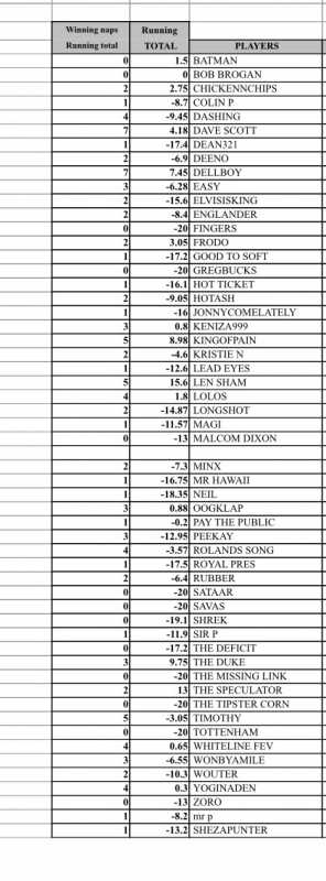Entrants that have given up the ghost, if they dont want a minus 70 score let me know and i`ll remove them form the scores, speak now or forever be remembered as kak tipsters.