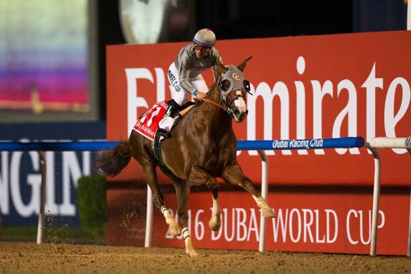 In a dominant, track-record setting performance compromised by the slippage of his saddle during the race, California Chrome (USA) avenged last year's second place performance by winning the $10 million Dubai World Cup sponsored by Emirates. In the process, he became the all-time leading money earner in North American racing history.