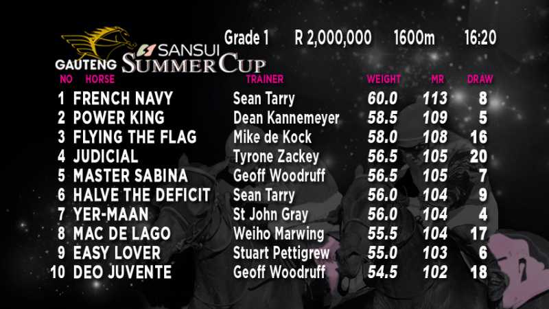 The final field and barrier positions for Johannesburg’s most prestigious race, the Gr 1 R2 million Gauteng SANSUI Summer Cup to be run over 2000m, was announced today at a ceremony at the SmokeHouse Grill in the City and the tension-filled atmosphere provided a precursor to the big day on November 28.