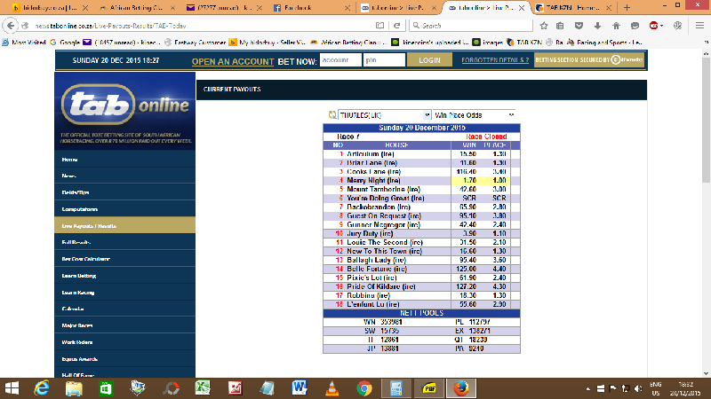 10 years 4 months agotriple tempo wrote: I find that the Turfontein pa never has value. The payouts are always lower than expected. I find the bet with biggest value is the jackpot quick mix. It has tremendous value, much more than a normal jp with similar odds.