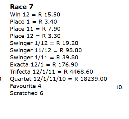 Todays payout you could say was an extremely high payout of R4400. Fancied runner won the first leg, the second leg was always the favorite on the french tote from the morning (tipped first in the quick mix tabsheet and the favorite in the forecast betting, the third leg the winner was deep in the red from the morning on the french tote (3 wins in a row on the tabsheet, tipped as the winner), the last leg the winner was paying R8 for a win 2 hours before the race on the French Tote). That said the fields was big. Not complaining about the payout today for sure