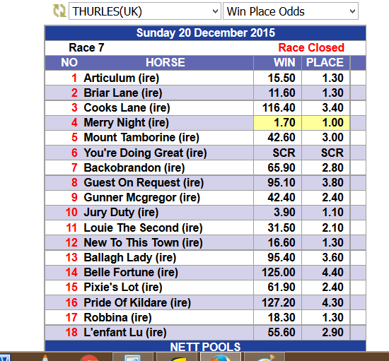 10 years 4 months ago - 10 years 4 months agoNow HOW DO ME EXPLAIN THIS ONE? Look at the RACE CLOSED PAYOUTS - How is it possible suddenly for all those final place dividends to change so drastically? I watched racing yesterday and the final prices showed after closing was the same as the official. Love to hear some explanation!!