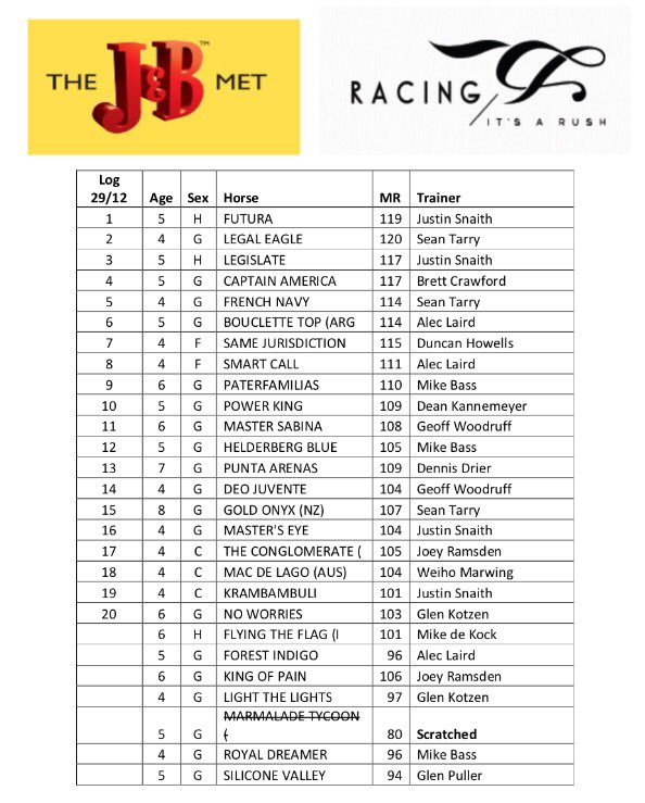 I'm sure he'll get in - a few doubtful runners imo including French Navy, Same Jurisdiction, Smart Call, Bouclette Top, Master Sabina etc - also not sure if Legislate will stay in (think they are going to go all out with him for the QP) - it could end up a very ordinary MET field bar the top one or two