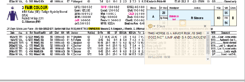 You can make notes easily with Adobe and the best part is you can go back weeks later and check your notes without having to remember to bring home your computaform from races after you've had a festive day!!
