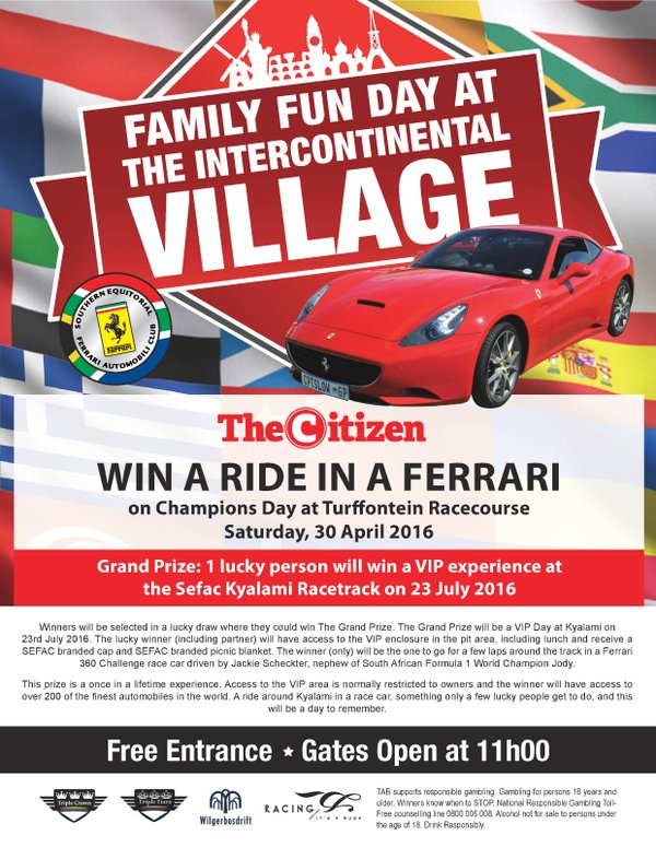 Gates on Saturday 30 April open at 11 and entrance is free. For more information or bookings for Champions Day on 30 April, please call 011 681 1702 or at www.itsarush.co.za