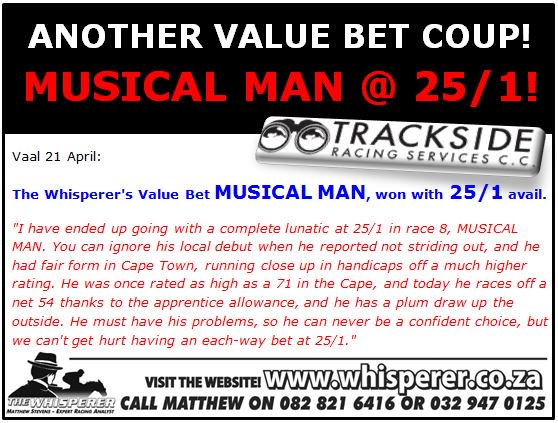 In the case of musical man --- The horse loves soft going, Form study will reveal that, the horse was having it's first run on the Vaal track, the horse opened at 25/1 and was backed in to 7/1 , had a decent run at Durbanville --- flopped badly ....in it's first attempt at the Turfontein track. I don't believe there is anything unethical or underhanded in the win --- these very factors caused me to mention the horse in the track discussion prior to the race.