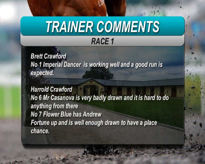 Race 1 -Imperial Dancer, drops in trip after a poor run over 1600m .Has shown enough pace to think he will cope with dropping to this trip, Well drawn and blinkers to sharpen