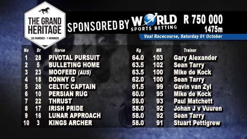 9 years 7 months agoA full field of 28-runners and two reserves have been unveiled for the inaugural running of The Grand Heritage, sponsored by World Sports Betting, at the Vaal Racecourse on 1 October.