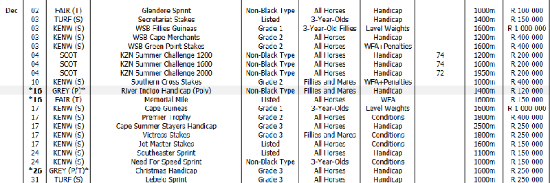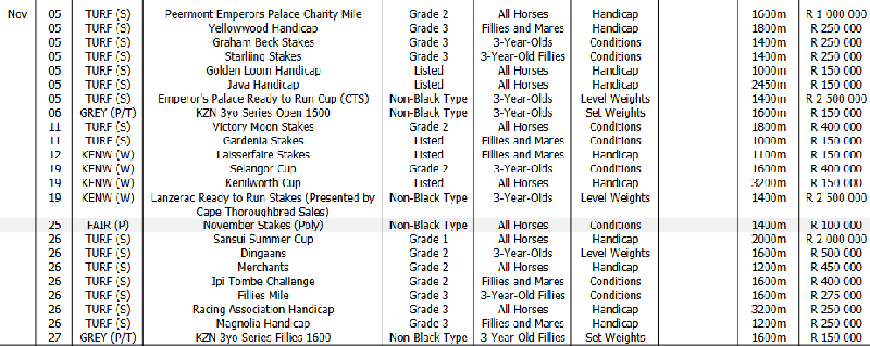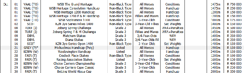 Feature races Oct/Nov/Dec