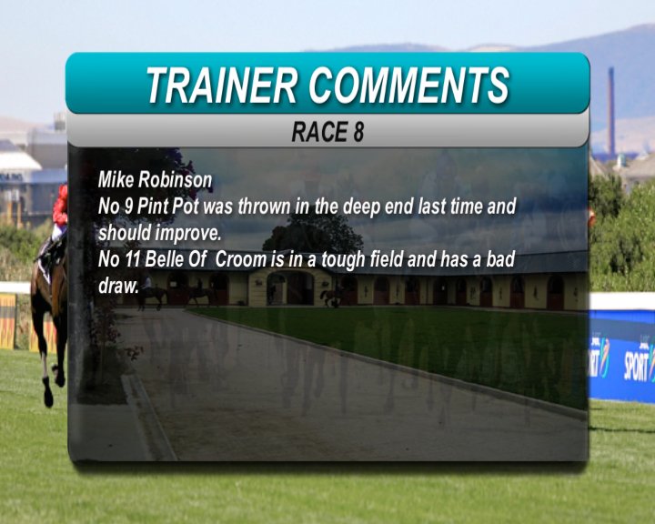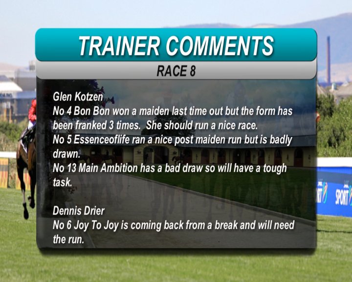 Race 8: Some smart improving 3yos, and the winner should come from them. Lady of the House and Joy to Joy have good form and look well in at the weights but have wide draws to overcome. Silver Captain has a big weight to shoulder, but is classy and very unlucky in the running last time when badly bumped and nearly coming down. Bon Bon and Cavalleira have nice draws and are progressive. Bon Bon is well and has a good ew chance. She will be even better over further and when we revert to the new course.