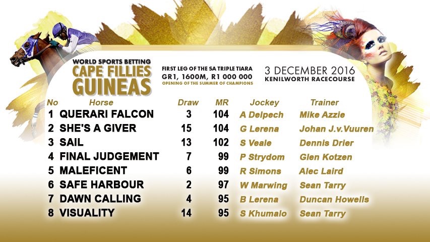 Azzie, who intends doing the same with Abashiri, added that Delpech has also been booked for Thekwini winner Querari Falcon in the World Sports Betting Fillies Guineas on the same card. She is joint top-rated with She’s A Giver who won Turffontein’s Princess Charlene Of Monaco Starling Stakes on her return earlier this month. Johan Janse van Vuuren has already declared Gavin Lerena.