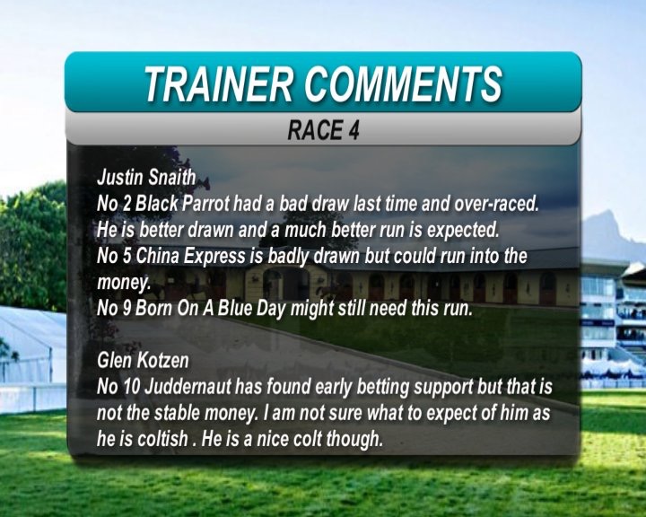 Race 4 – JUDDERNAUT (10): We are hopeful he runs in the placings.
