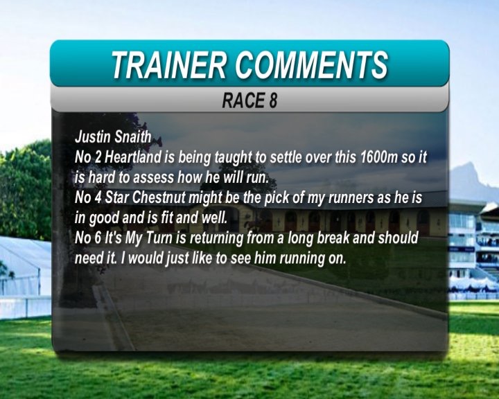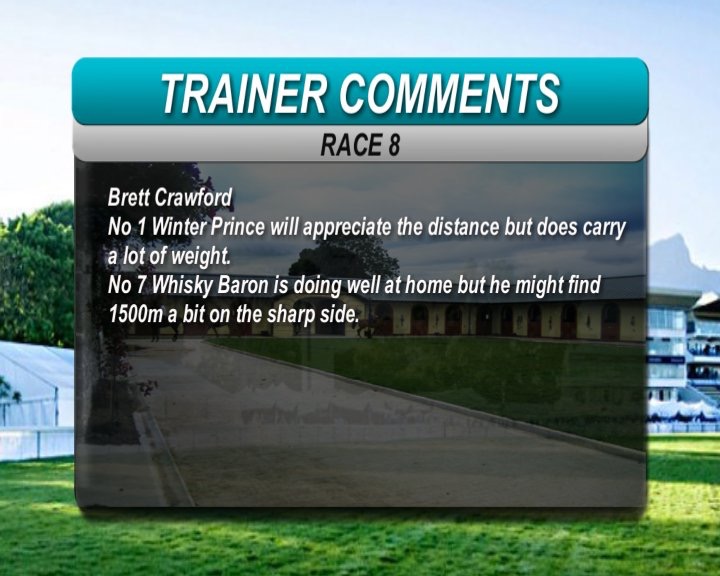 Race 8: Whiskey Baron is the right one after the scratchings.