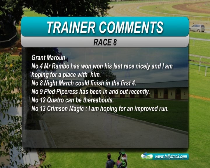 DIANNE STENGER: Race 2 – GLENCASSLEY (6): She is a nice horse and I am putting her in the deep end to see what we have got.