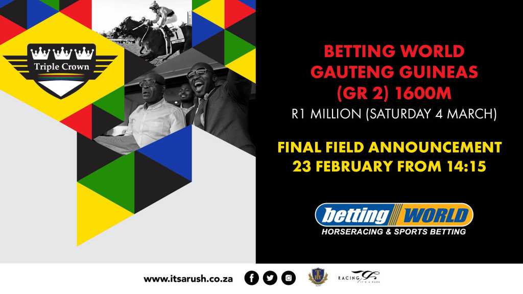 Entries for the R1-milion Betting World Gauteng Guineas (Grade 2) over 1600m at Turffontein on Saturday 4 March.