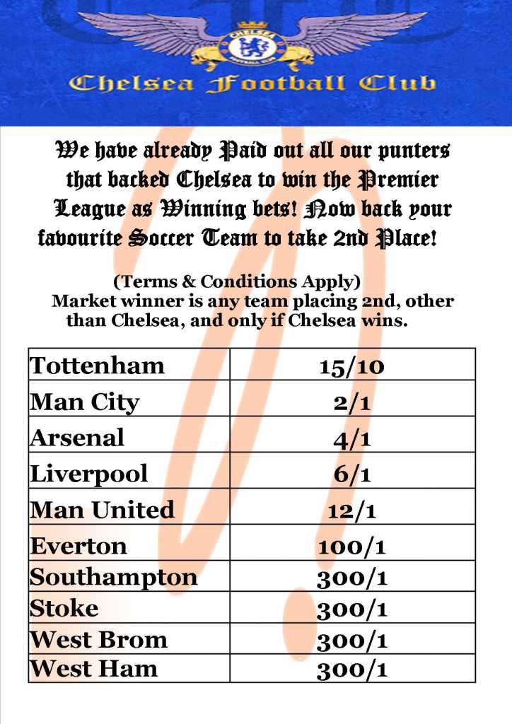 9 years 2 months agochrisb wrote: They should give odds on Chelsea finishing second because Man City are going to win the league.