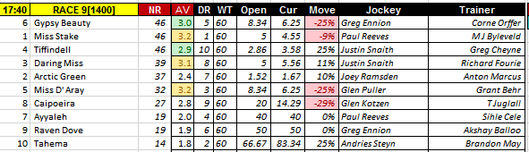 R2, Esteemal, the support would suggest she is a runner here, 28/10 into 16/10 whilst the favourite, Made In Hollywood is on a wicked drift 7/10 now 11/10. Wouldn't be a surprise to see Esteemal top of the boards come race time.