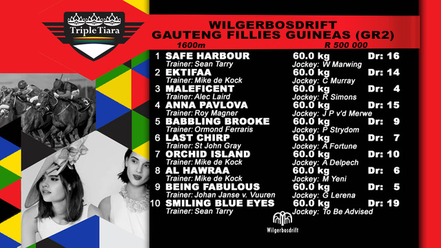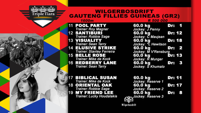 Final field for the R500,000 Wilgerbosdrift Gauteng Fillies Guineas (Grade 2)(1st Leg Wilgerbosdrift SA Triple Tiara) over 1600m