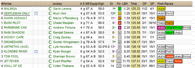 Morning All...horses not to be excluded from exotics today are Cold Cash [improving with racing experience and increase in distance but very short in the betting] in Race 1, Polly Wolly Doodle in Race 3, Duzi Moon and Jackman in Race 7, Mess in Race 9 and my best bet for the day is Gentlemen Only in Race 8......well drawn, jockey is strong and claims, runs well in the soft and in the top 2 of my ratings...swingers with Aza Arrow...
