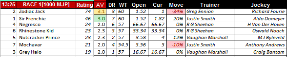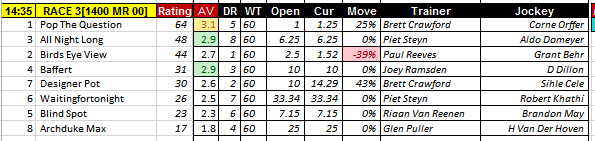 Afternoon All...best Bet for the day is Baroness Mary [R5] despite not being top of the ratings the top two are poorly drawn and the fields that it raced against in its last two races, the post race form has been poor...Baroness Mary has a good draw, jockey trainer combination just keeps popping out the winners. Also, add Zodiac Jack [R1] and in Race 3 taking a chance & going short with Pop the Question and Birds Eye View...enjoy the day and Turfontein tonight...