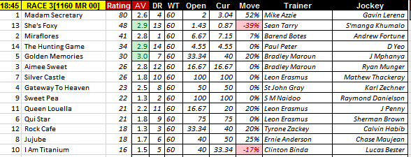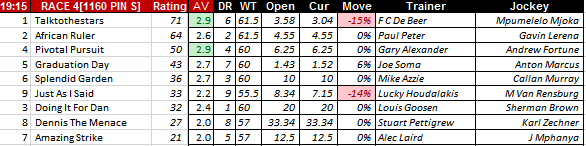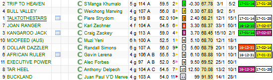 A couple to do the doubles and trebles with Cape Marigold...R3 She's Foxy [everything has been said already] and Race 4 Talktothestars...as long as apprentice Mjoka gives it a good ride, its last run at Turfontein was excellent and hopefully no ill effects from the holiday in Cape Town...
