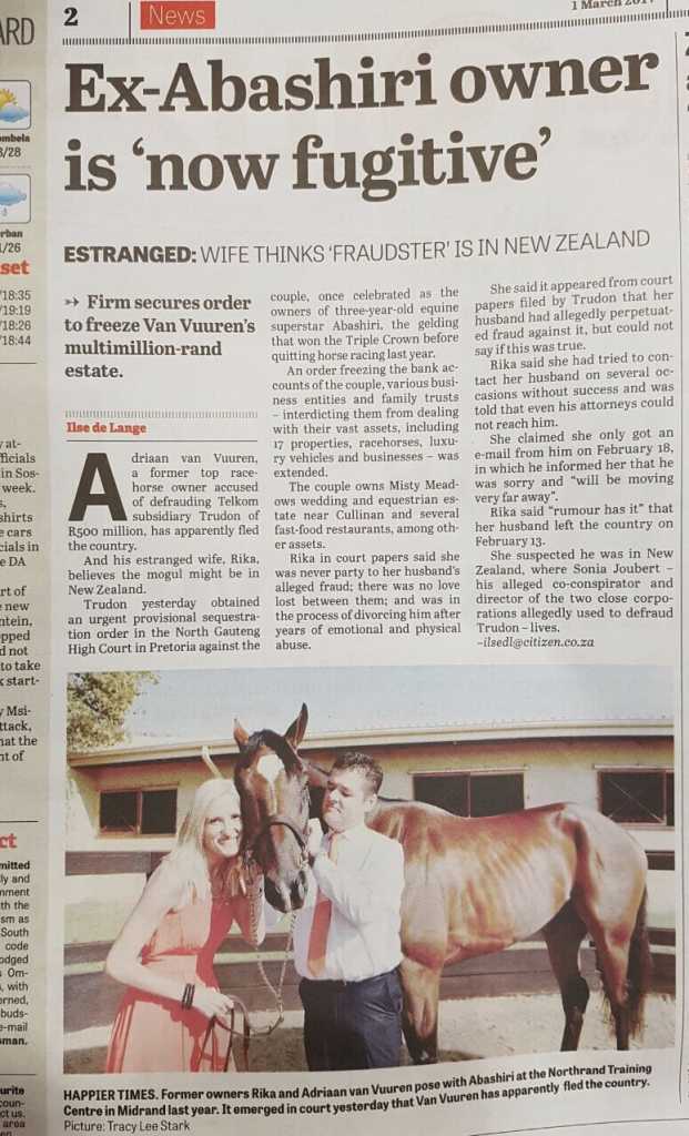 9 years 1 month ago - 9 years 1 month agoWas not only Mike Azzie that was taken in by them...the vast majority of racing folk were full of praise for the "IT whizz kid" and his millions, in fact a lot of them were sympathetic to the couple and accusations of them being "Ripped Off" were the norm in the latter months leading up to the fertilizer hitting the windmill..Curlin wrote: I wonder what the Azzman thinks of all of this (or as he considered them, his family) :silly: