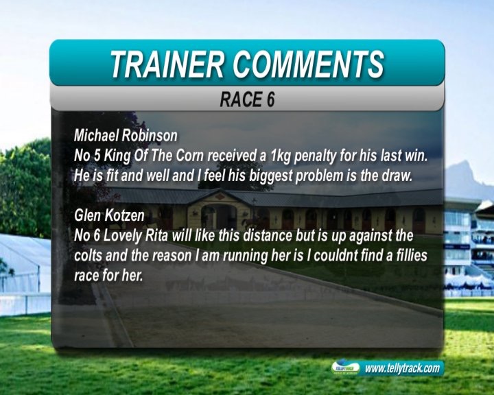 Race 6: Cape Laddie ran well after a break, and he is weighted to win this if he sees out the trip.(I don't bother with the 2nd run after a break myth). King of the Corn is progressive and is the danger. There are quite a few with chances- best of the rest are Waiting for Rain, Friendly Tibbs and Kilrain.