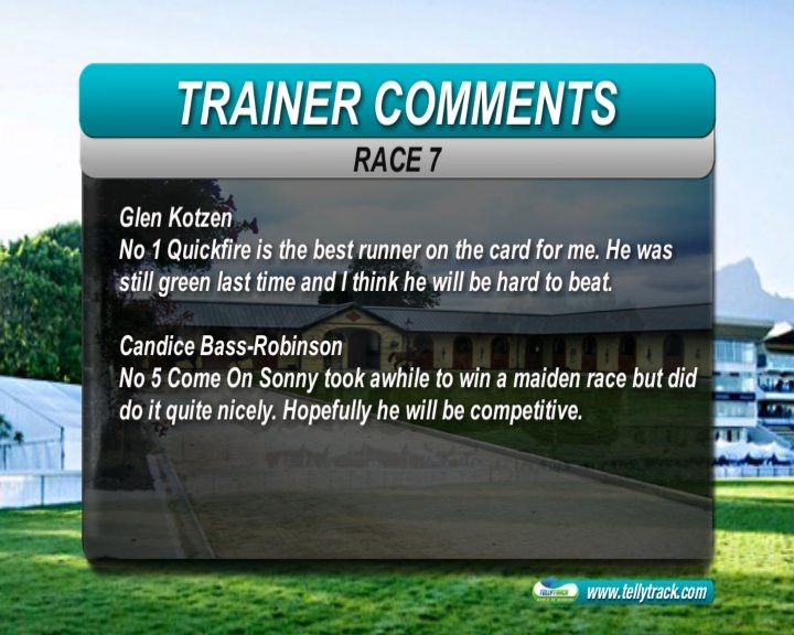 Race 7: A small but tricky race . I will go with the improving 3yos Quickfire and Come on Sonny. Free Agent looks the best of the older horses.