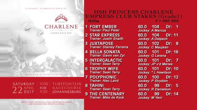 The running of this year’s race will be a royal affair as HSH Princess Charlene of Monaco will be at the Joburg track on Saturday. Her support of the raceday means a number of charities are set to benefit among those the Red Cross, Highveld Horse Care Unit and Gugu Lesizwe Primary School.