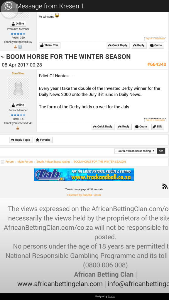 8 years 10 months agoshadfighter wrote: Striker's Column in the Citizen newspaper:- Just wondering if any clanners reads Strydoms comments in the Saturday Citizen. We racing newbies are very gullible and will believe anything a jockey says. This is what Striker had to say to about the 2 horses that he was riding. '' I ride Lady of the House who is well held on numerous runs and has her work cut out to place". The other horse " I ride Captain Splendid who is well held and i would be pleased if he found a place". Both of the above horses won their respective races. Needless to say as a newbie i scratched both his horses from my selections.All i want to know is , was his comments fair to the punter. I think it was completely misleading - last time for me to ever read his column again.